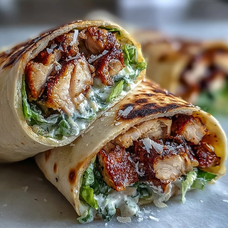 Save One Tuesday evening, I was standing in my kitchen staring at a half-empty Caesar salad container and some leftover naan from the night before, when it hit me—why not wrap them together? The result was so unexpectedly good that I've been making these fusion wraps ever since. There's something magical about warm, buttery garlic naan cradling crisp romaine and perfectly charred chicken, all held together by tangy Caesar dressing.