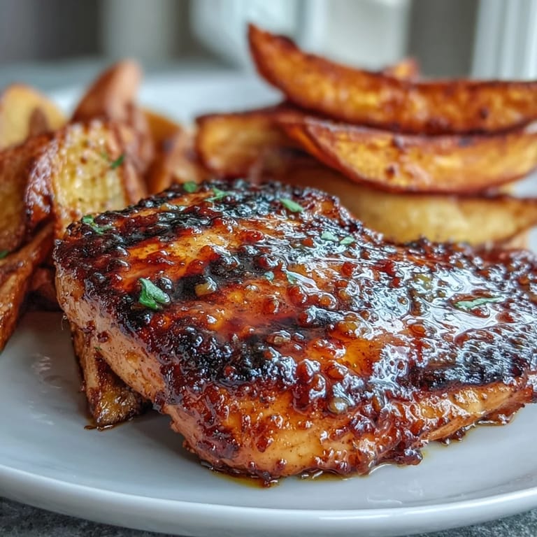 Save There's something about the smell of mustard and honey hitting a hot grill that makes everything stop for a moment. My neighbor Chris came over on a random Tuesday evening, and I had some chicken breasts that needed rescuing from the back of the freezer. I threw together this marinade on impulse, mostly because I had jars of both mustards sitting in the fridge, and somehow it became the meal everyone still talks about. The sweet potato wedges were honestly an afterthought, but they turned into the unexpected star that night.